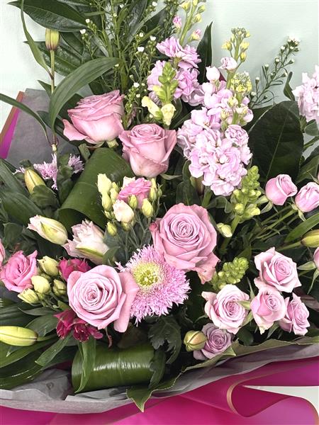 Our luxury all-pink front facing Valentine’s bouquet is romantic, indulgent and designed to make hearts skip a beat. Created with premium pink roses, soft seasonal Valentine’s blooms and rich foliage, this bouquet is styled to be admired from the front — full, elegant and unapologetically luxurious.