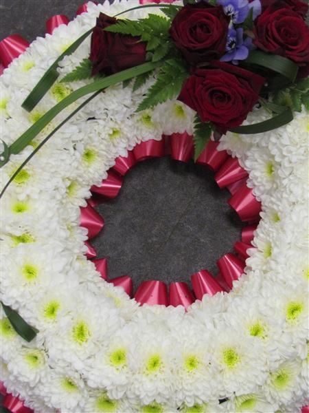 A clean and neat, compact wreath. Made with white based flowers topped with a coloured spray of your choice.