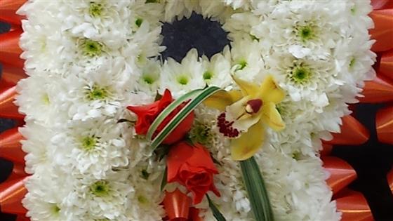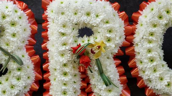 This tribute is based in white double chrysanthemum and ribbon edged in a colour of your choice or you can opt for a natural foliage edge and we place a flower spray on each letter in complimenting colours . If you have a colour in mind that is not listed please call and speak to one of our dedicated florists , we will do all we can to make this piece personal to your requirements.