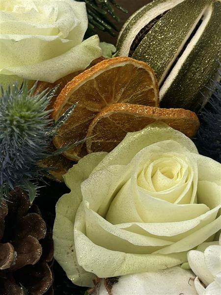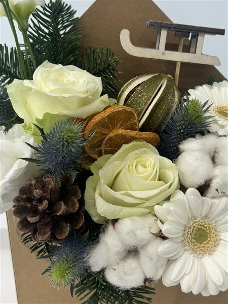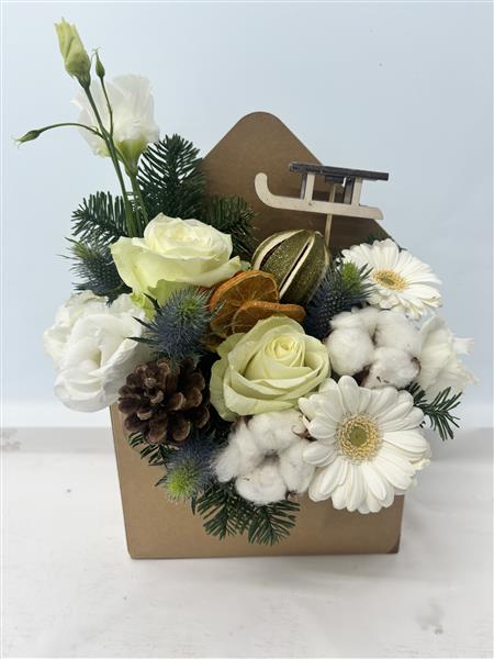 A cute flower gift arrangement. Made with white roses, scented pine-cones, orange slices, snowy cotton and white lissianthus with blue thistles. All set into a Kraft envelope to make the most adorable Christmas flower gift.