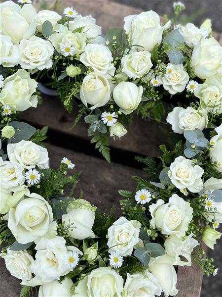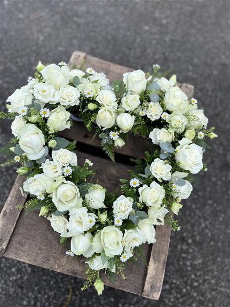 Discover our exquisite Countryside Heart Wreath, an elegant tribute that brings a touch of nature's finest to your memorial arrangements. Crafted with the best large head white roses and complemented by delicate sweetheart roses, this wreath exudes timeless beauty. Luxurious, scented foliage completes the arrangement, creating a harmonious blend of fragrance and visual appeal.