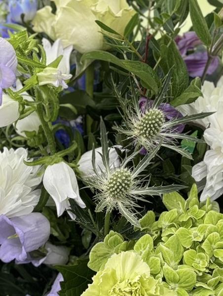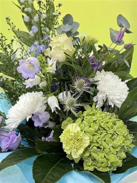 Cool, calm, and wintery — Festive & Frosty is a front-facing bouquet inspired by icy mornings and frosted petals. Designed with delicate white, lilac, and soft blue flowers, this natural arrangement captures the peaceful beauty of winter in bloom. Perfect for brightening up your home or sending as a thoughtful gift, each bouquet is handcrafted by Townend Florist Sheffield with care and creativity.