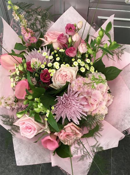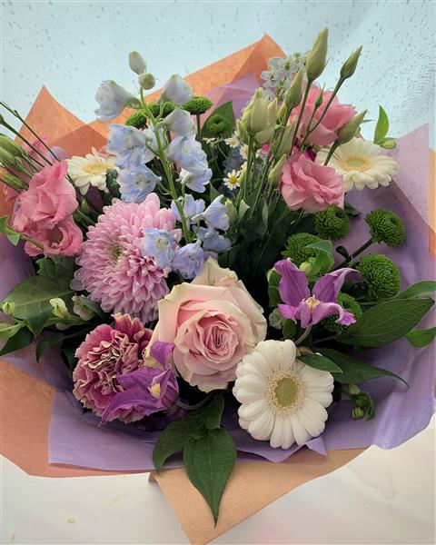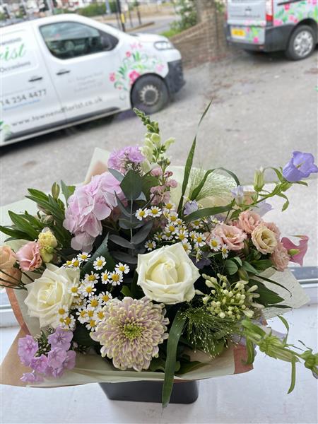 Each and every bouquet is made by a florist using the best flowers and colour combination from our fresh flower delivery on the day. Please be aware that your flower bouquet will differ from the example picture.