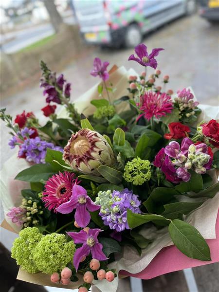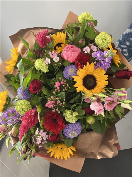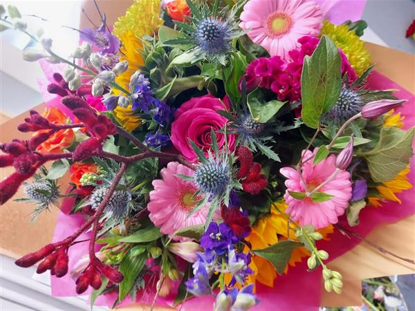 Each and every bouquet is made by a florist using the best flowers and colour combination from our fresh flower delivery on the day. Please be aware that your flower bouquet will differ from the example picture.