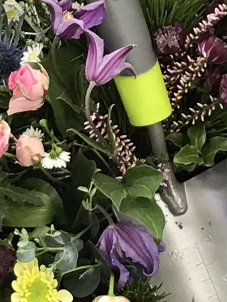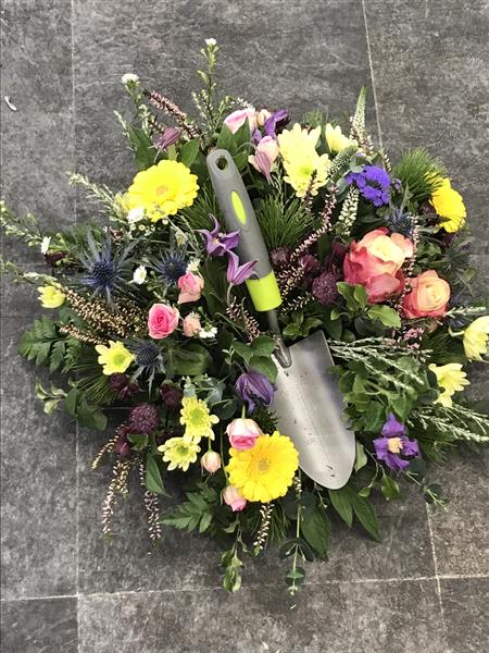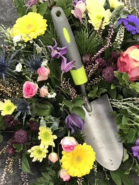 A special tribute. Using a garden trowel with an array of natural, colourful and seasonal garden flowers and foliage.
