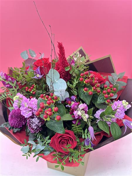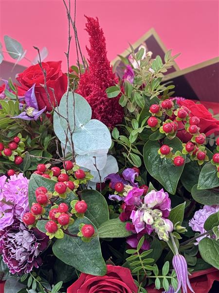 Love, Actually… looks a lot like this. A romantic Valentine’s bouquet full of red roses, berry tones, soft pinks and textured seasonal flowers, all brought together with beautiful greenery. This all round design is handmade by Townend Florist in Sheffield and created to feel thoughtful, exciting and anything but generic. Real flowers, real designs, and proper care put into every stem.