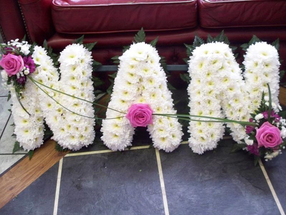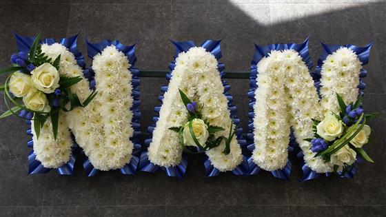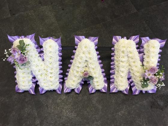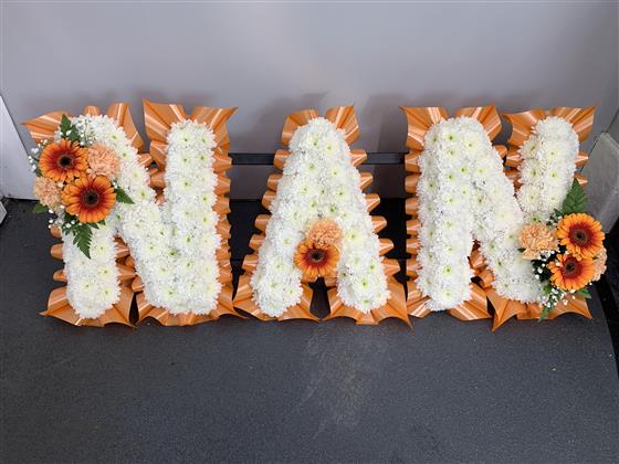 This tribute is based in white double chrysanthemum and ribbon edged in a colour of your choice or you can opt for a natural foliage edge and we place a flower spray on each letter in complimenting colours . If you have a colour in mind that is not listed please call and speak to one of our dedicated florists , we will do all we can to make this piece personal to your requirements.