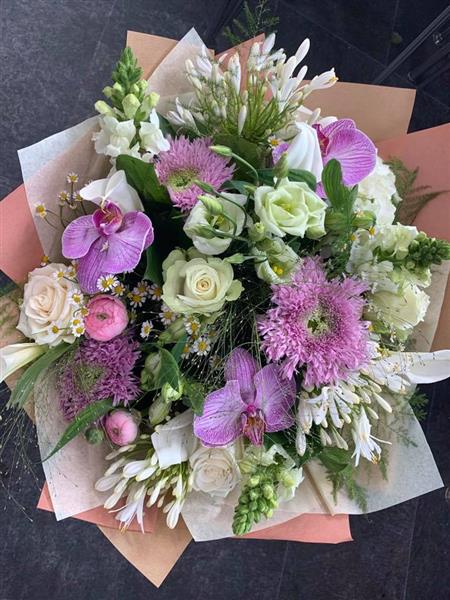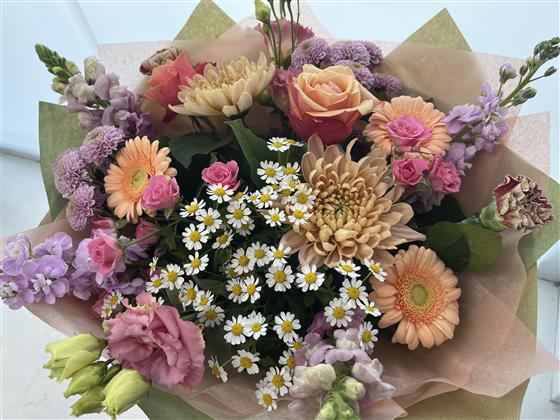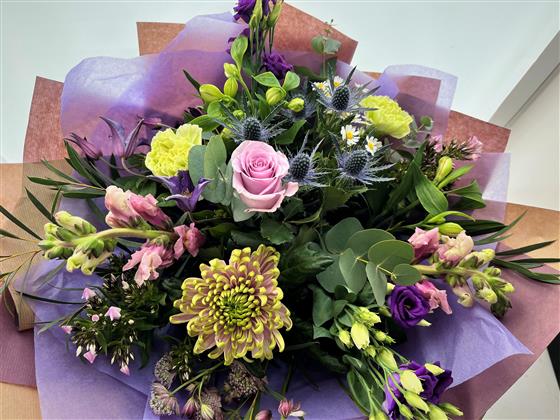 Each and every bouquet is made by a florist using the best flowers and colour combination from our fresh flower delivery on the day. Please be aware that your flower bouquet will differ from the example picture.