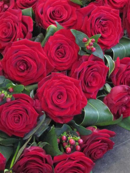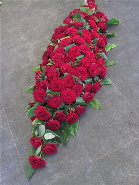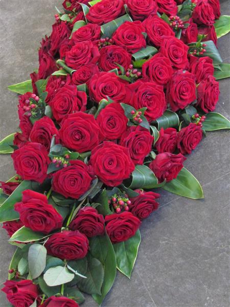 A piece made from the largest headed Roses, using a small amount of foliage and select berries in between each rose. Of course we can change the rose colour to your requirements to make this casket spray truly personal for your loved one.