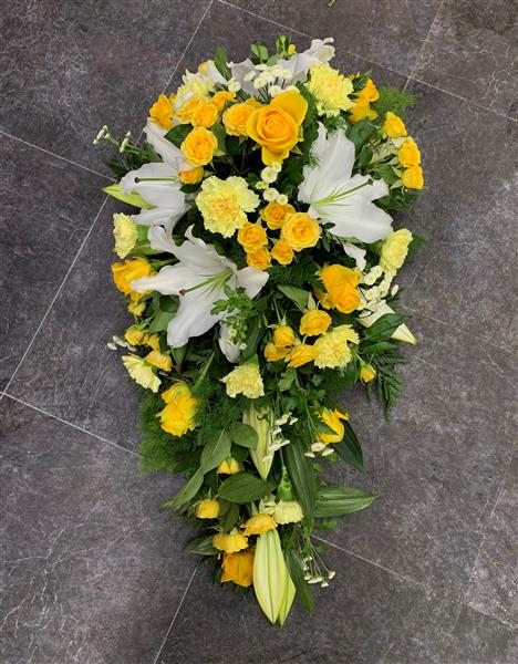 Introducing our elegant Rose, Carnation, and Lily Oasis Spray. This stunning tribute combines the timeless beauty of roses, the charm of carnations, and the grace of lilies, all complemented by luxurious foliage. To make this arrangement truly personal, you can choose the predominant colour, ensuring the tribute reflects your unique sentiments and honours your loved one in the most heartfelt way.