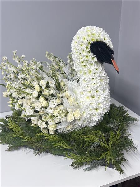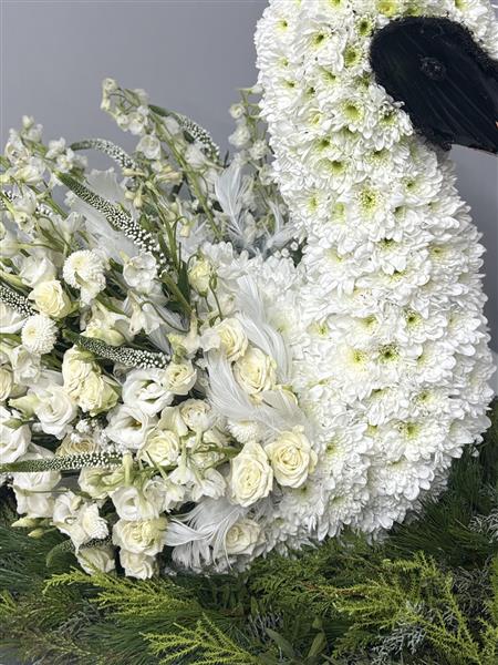 A large, 3D sculpted swan made solely of flowers with feathers created with nwhite seasonal flowers.