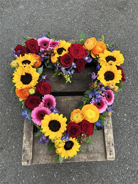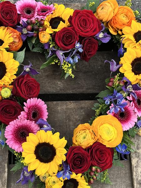 A bright and vibrant twist to the classic funeral heart, Created by us with summer in mind using an array of colours to reflect the bright, happy times spent with your loved one.