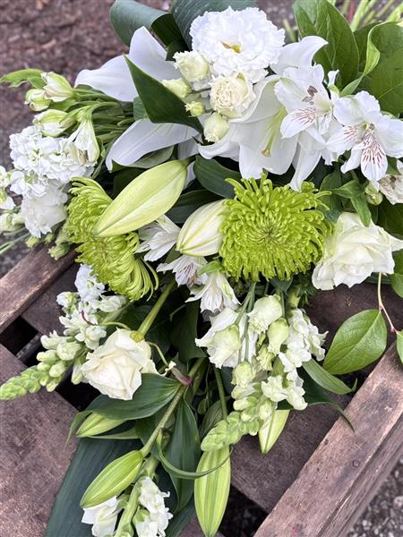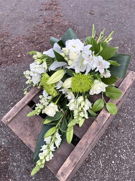 Designed using fresh seasonal blooms in soft whites and natural green tones, this traditional tied sheaf offers a graceful and respectful way to honour and remember a loved one. Each tribute is made to order using the freshest flowers available, ensuring it arrives looking beautiful and appropriate for the occasion.
