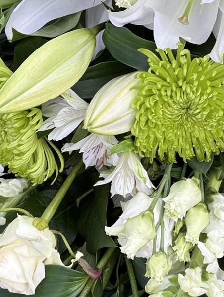 This elegant white and green tied sheaf is a timeless and thoughtful funeral tribute, created with care by Townend Florist, an independent Sheffield florist with many years of experience in funeral and sympathy flowers.