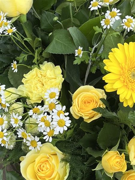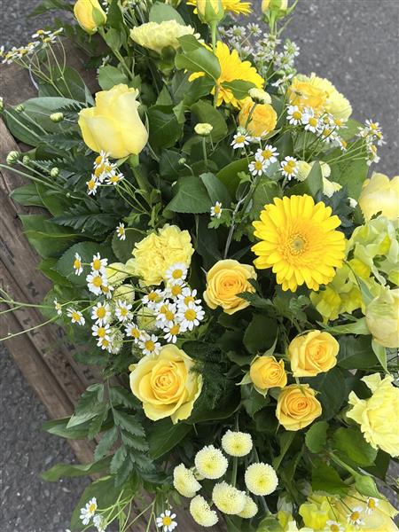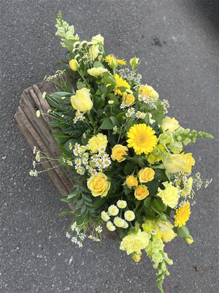 Introducing our elegant Yellow Flower Oasis Funeral Spray. This stunning arrangement features a variety of radiant yellow blooms, meticulously paired with luxurious green foliage to create a vibrant and heartfelt tribute. Perfect for honouring your loved one's memory, this floral spray exudes warmth and sophistication, making it an ideal choice for any memorial service.