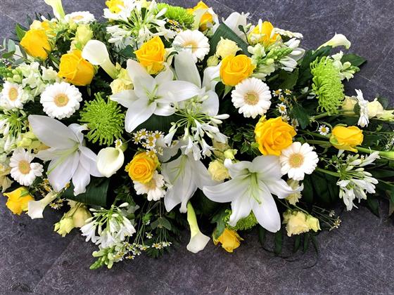 Celebrate a life well-lived with our Yellow and White Coffin Spray, a tribute of love and devotion. Available now!