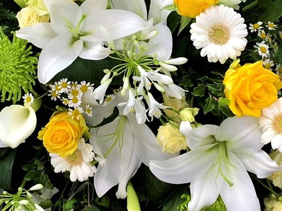 Introducing our Yellow and White Coffin Spray, an exquisite arrangement featuring a beautiful array of yellow and white flowers. Nestled in luscious green foliage, this piece creates a truly stunning tribute. Lovingly crafted with dedication by our skilled florists at Townend Florist, each flower is selected with care to honour your loved one’s memory. This colorful tribute captures the essence of elegance and grace, making it a perfect and heartfelt farewell.
